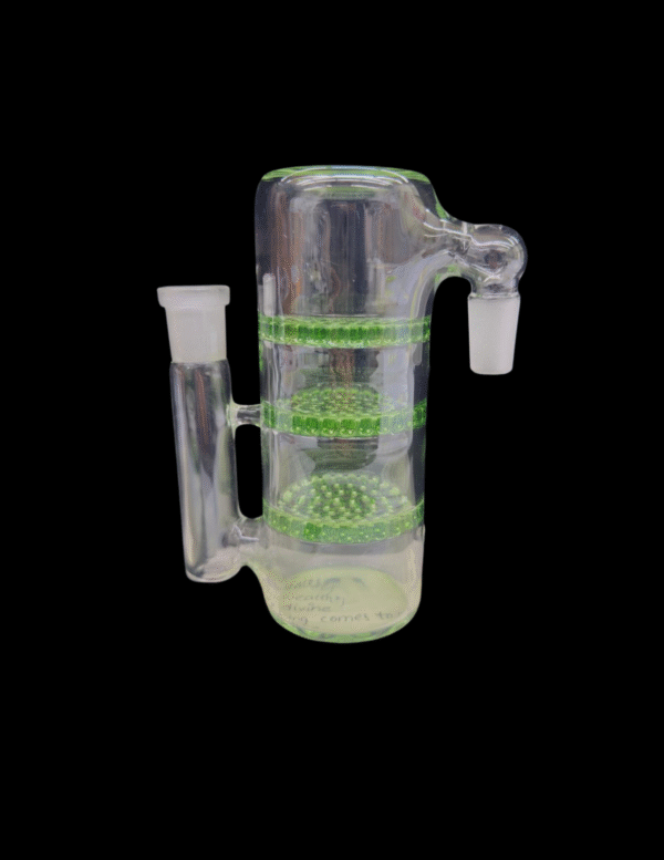 Enjoy ultra-smooth hits with the 14mm 90° Triple Honeycomb Ash Catcher. Built from durable glass, this ash catcher features three honeycomb percolators for superior smoke filtration and cooling. The 90-degree joint fits most 14mm water pipes, keeping your rig clean while enhancing airflow and flavor. A perfect upgrade for anyone who values performance and purity in every hit.