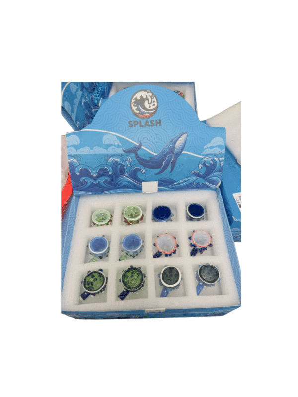 Add a touch of creativity and color to your offerings with this 12-piece display of 14mm artistic glass bowls. Each bowl features a unique hand-blown design, making every piece one-of-a-kind. These bowls are compatible with most standard 14mm water pipes and are perfect for customers looking to personalize their smoking setup. Crafted from high-quality glass, they offer durability, functionality, and eye-catching style. Ideal for smoke shops and retail counters, this assorted display is a guaranteed attention-grabber.