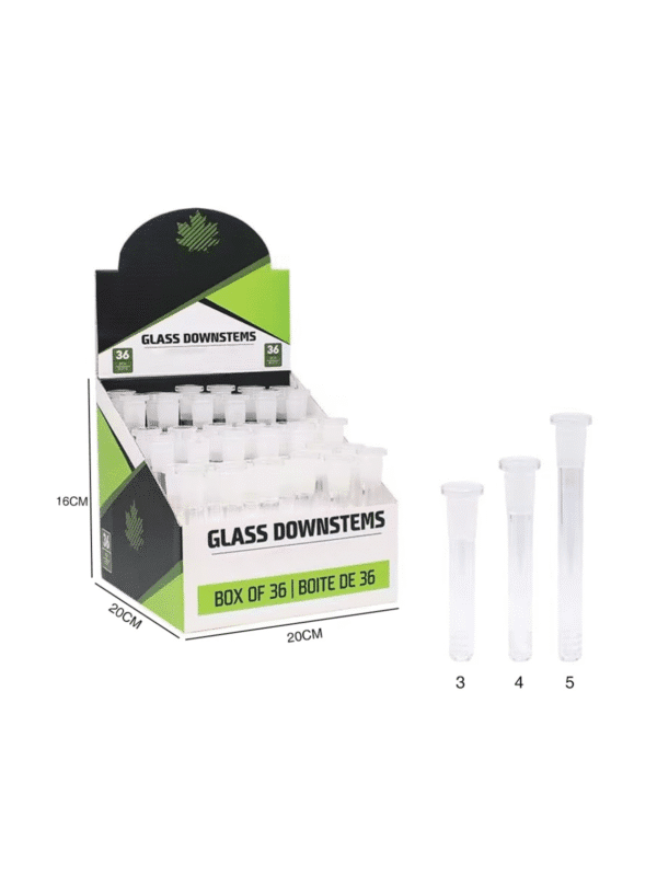 This convenient display pack includes 36 high-quality glass downstems, with 12 pieces each of 3-inch, 4-inch, and 5-inch sizes. Designed to fit most standard water pipes, these downstems are ideal for smoke shops, bulk buyers, or anyone needing reliable replacements in various lengths. Made from durable borosilicate glass, each downstem offers smooth airflow and easy compatibility with 14mm or 18mm fittings. Keep your display organized and your customers equipped with this ready-to-sell assortment.