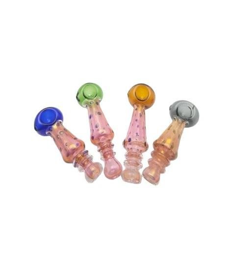Chic 5″ Glass Pipe featuring a gold finish, available in three assorted designs. Crafted from high-quality glass, this pipe provides a luxurious look and a smooth smoking experience.