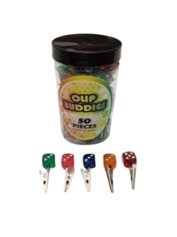Each jar contains 50 assorted roach clips, each featuring a classic metal clip base topped with a vibrant dice cube. The playful design makes them perfect for resale, display, or even party favors. They add a unique touch to any collection and are easy to use, store, and clean.
