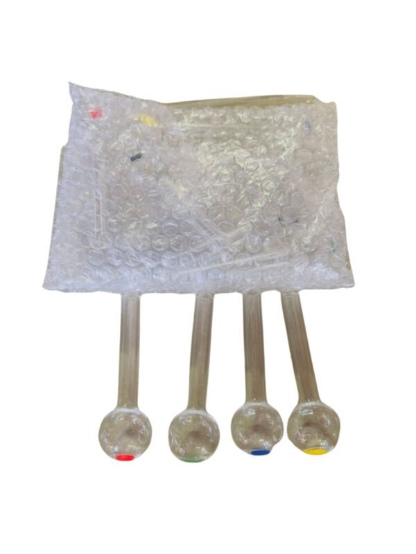 4″ glass oil burner with colorful dots, sold 10 per bag. Durable, stylish, and perfect for resale or everyday use.