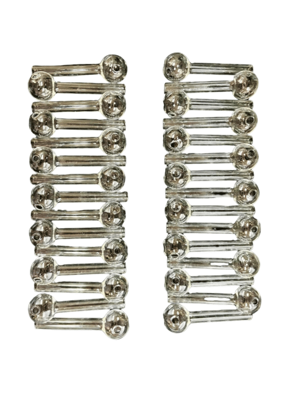 Our 4-inch clear oil burners are crafted from durable glass, designed for reliability and consistent performance. Each burner features a clean, simple design and a standard bowl for ease of use. Perfect for wholesale or retail, this bag of 30 oil burners offers excellent value for stores and resellers. The compact 4-inch size makes them easy to handle and store, while the clear glass construction ensures quality and visibility of contents.